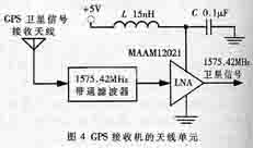 可见,GPS接收机中各级单元电路的内部噪声对级联后总噪声系数的响应有所不同,级数越靠前的单元电路的噪声系数对总噪声系数的影响越大。因此,总噪声系数主要取决于最前面几级单元电路的噪声系数,其中天线热噪声对接收机性能影响最大,故设计时采用接收天线、射频频段选择带通滤波器及高频低噪放(LNA)等器件组成天线单元(如图4所示)。天线单元采用DC 5V供电,其中LNA采用高增益、低噪声、高频放大器MAAM12021,其增益高达21dB、噪声系数低于1.55dB,有利于降低GPS接收机的总噪声系数;其工作频段处于1.5~1.6GHz,适合于C/A码GPS接收机的频带需求,可满足高增益和低噪声系数的性能指标要求。
